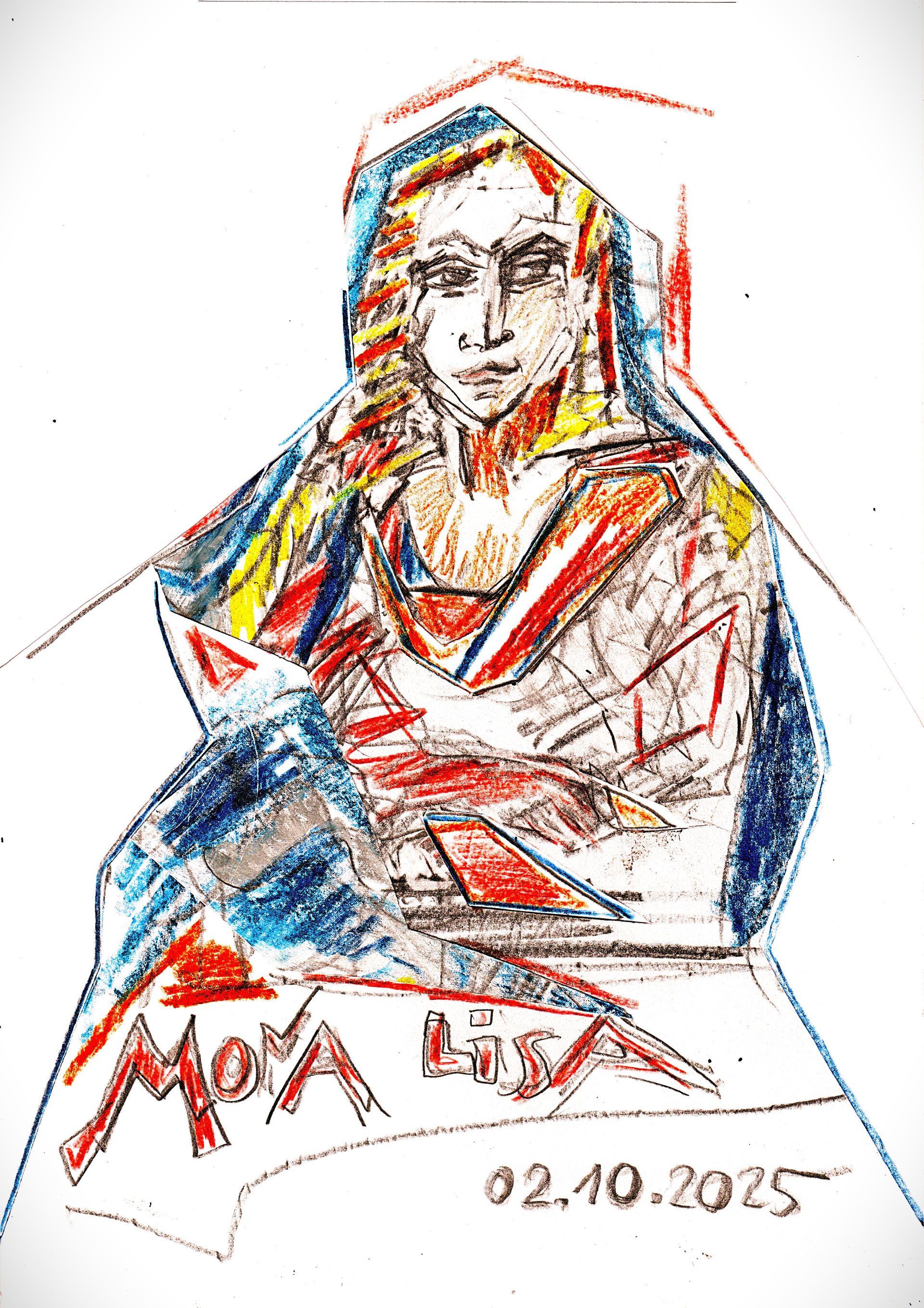 Mit mir entdecken Sie fantastische Orte. Zeichnung zum Thema Mona Lisa. Hier im Zusammenhang mit einer Studie zu meiner neuen Wohnung in Dahlenburg. Weitere Studien zur Außenansicht 21368 Dahlenburg, Lüneburger Str. 14 werden folgen. Ich halte Sie immer auf dem Laufenden. DIN A 4 Bleistiftzeichnung auf stabilen Papier. vom 17.08.2025.
